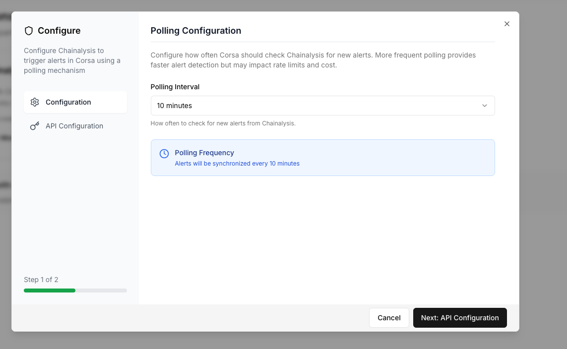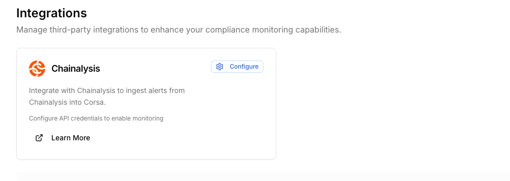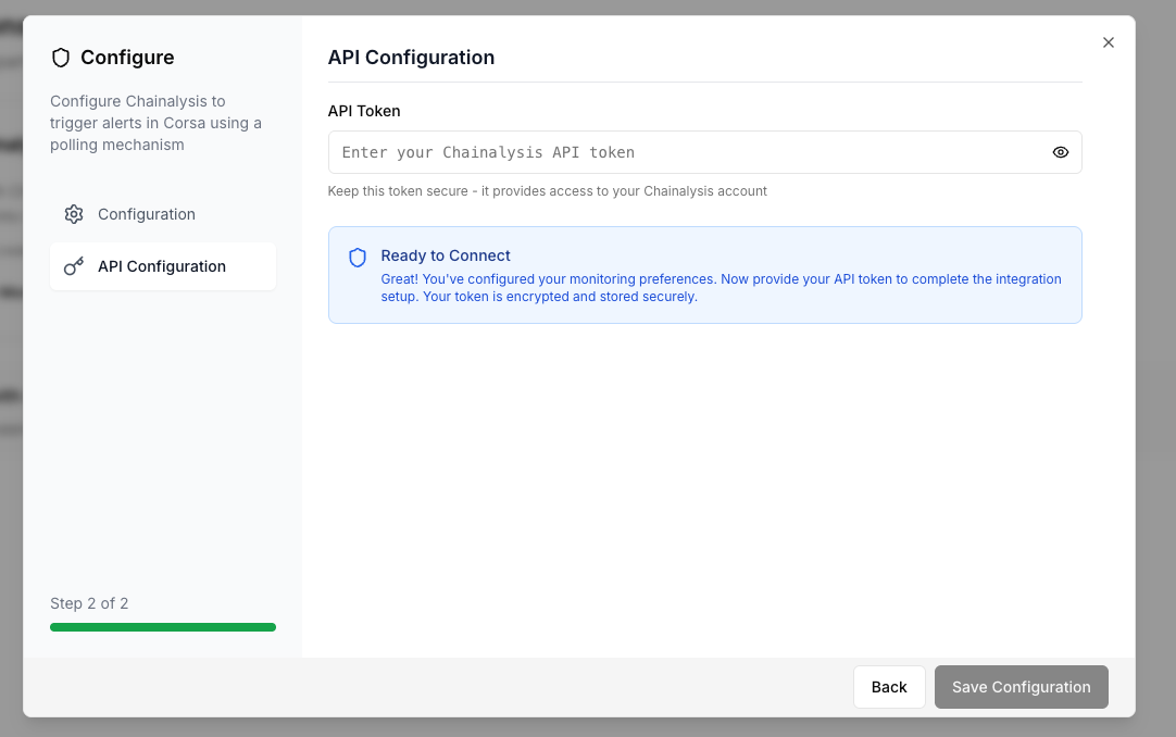 Secure Connection You start by securely linking your Chainalysis KYT account to Corsa. This is a one-time setup that authorizes Corsa to read and update alert information on your behalf. All credentials are fully encrypted and securely stored.