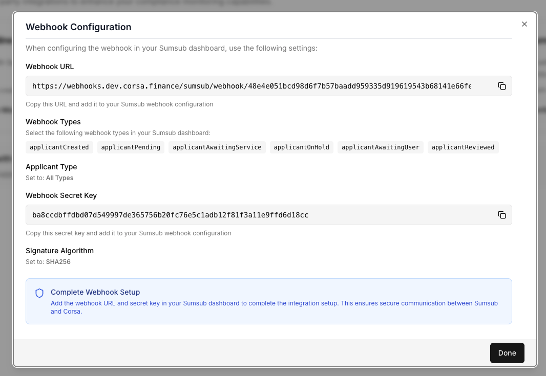 - Viewing webhook configuration later: If you need to retrieve the webhook configuration later, you can click the "Webhook Config" button in the Corsa integration settings, or use the