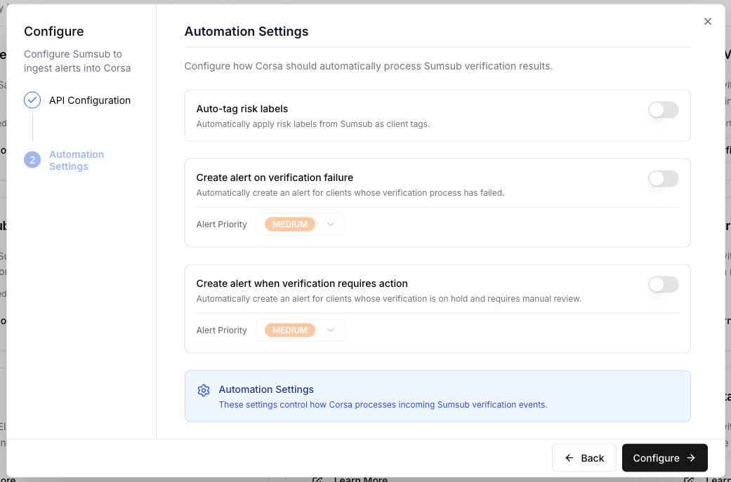 Configure Automation Settings - customize how Corsa processes Sumsub verification events: