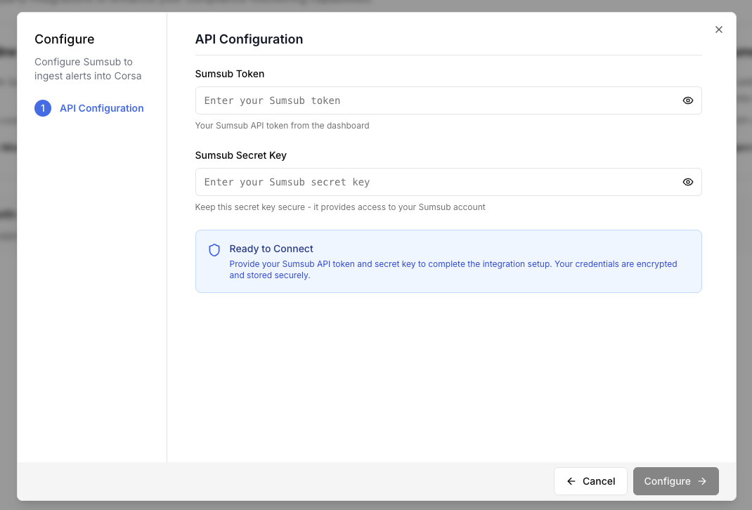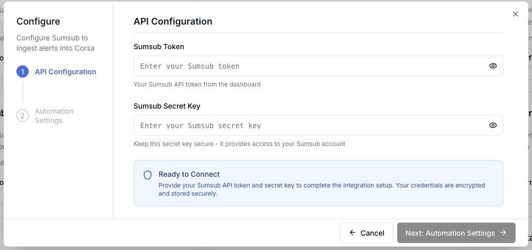 You start by securely linking your Sumsub account to Corsa. This is a one-time setup that authorizes Corsa to receive verification information from Sumsub on your behalf. All credentials are fully encrypted and securely stored.