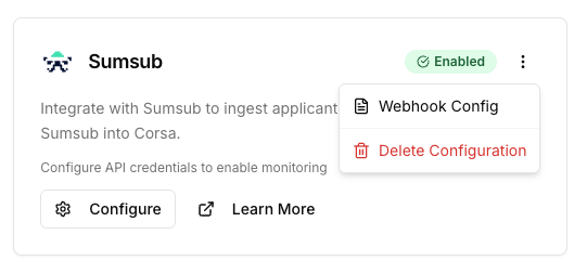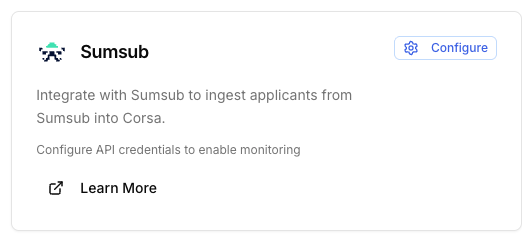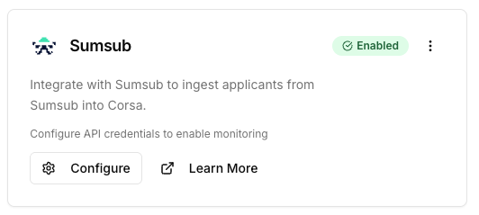 The Sumsub integration connects your Sumsub account directly to the Corsa platform. All Know Your Customer (KYC) verification results and applicant data are automatically synced from Sumsub into your Corsa dashboard via real-time webhooks.