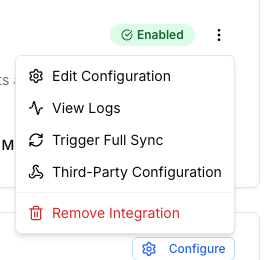 You should also configure the webhook url to the one shown in the dialog with the specified events types. You can alway see these configurations by clicking the three dotted button on the integration card and clicking "Third-Party Configuration".